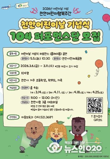 (뉴스인020 = 김성길 기자) 천안시는 제104회 어린이날을 맞아 기념식 무대를 함께 꾸밀 ‘104 퍼포먼스단’을 모집한다고 6일 밝혔다.