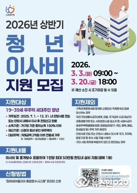 (뉴스인020 = 김성길 기자) 안양시는 청년가구의 초기 정착비용 부담 완화를 위해 이사비용을 최대 50만원까지 지원하는 ‘청년가구 이사비 지원’ 사업을 올해도 시행한다고 6일 밝혔다.