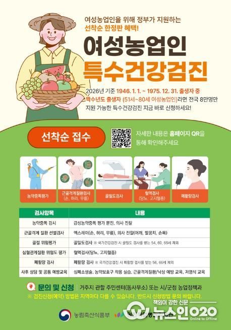 (뉴스인020 = 김성길 기자) 오산시는 농작업으로 인한 직업성 질환을 예방하고 여성농업인의 건강 증진을 위해 ‘여성농업인 특수건강검진 지원사업’을 추진한다고 밝혔다.