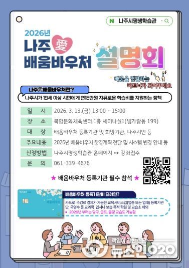 나주시는 오는 13일 오후 1시 복합문화체육센터 1층 세미나실1(빛가람동 199)에서 ‘2026년 나주애(愛) 배움바우처 설명회’를 개최한다고 6일 밝혔다.