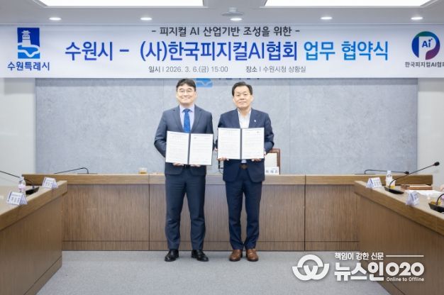 (뉴스인020 = 김성길 기자) 수원특례시와 (사)한국피지컬에이아이(AI)협회는 6일 시청 상황실에서 업무협약을 체결하고, 피지컬 인공지능(AI) 산업 활성화를 위해 적극적으로 협력하기로 했다.