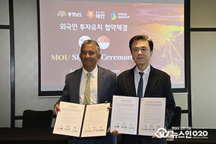 충남도에 따르면 김 지사는 6일 싱가포르 스위소텔 더 스탬포드 호텔에서 니틴 압테 뷔나그룹 대표, 정광진 뷔나그룹 한국 대표, 가세로 태안군수와 투자 양해각서(MOU)를 체결했다.