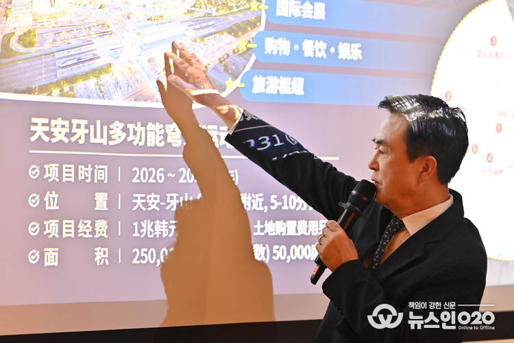 ▲김태흠 충남도지사 스위소텔 더 스탬포드 호텔에서 화교 기업인·투자자들에게 천안아산 다목적 돔구장 프로젝트를 설명하고 있다.