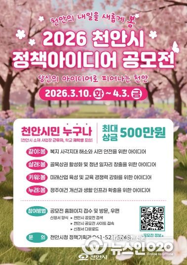 (뉴스인020 = 김성길 기자) 천안시가 시민의 창의적인 아이디어를 시정에 반영하고 정책 참여 문화를 확산하기 위해 ‘2026 천안시 정책 아이디어 공모전’을 개최한다.