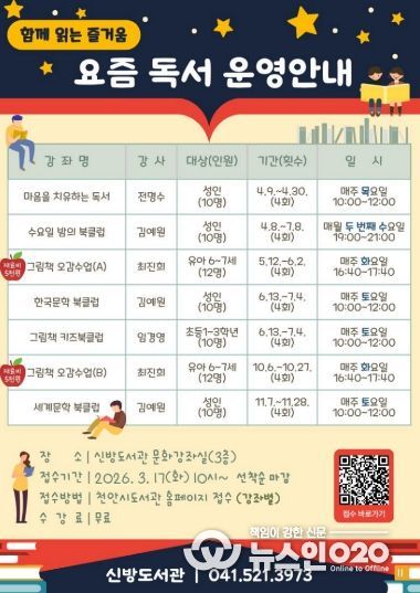 (뉴스인020 = 김성길 기자) 천안시 신방도서관은 내달부터 독서프로그램 ‘요즘 독서’를 운영한다고 10일 밝혔다.