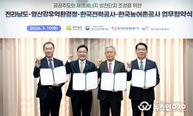 (뉴스인020 = 김성길 기자) 전라남도는 10일 한국전력공사 회의실에서 한국전력, 한국농어촌공사, 영산강유역환경청과 공공 주도 재생에너지 발전단지 조성과 안정적 전력 공급을 위한 업무협약을 했다.