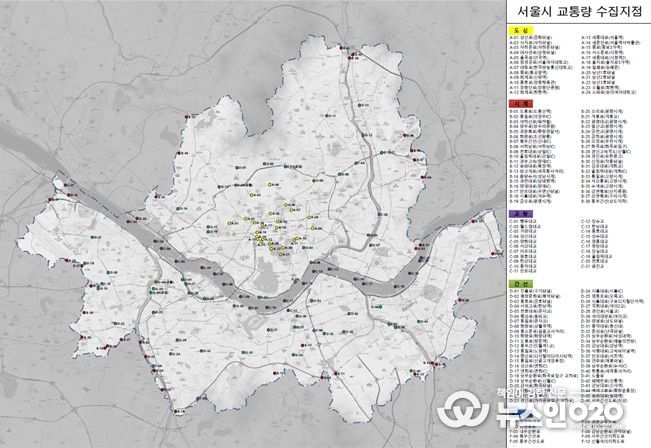 교통량은 서울 시내 주요도로 134개 지점에서 조사했으며, 통행속도는 510개 주요도로를 주행한 택시 위치정보(GPS)와 도시고속도로 내 설치된 1,153대의 지점 검지기 데이터 활용해서 산출했다.