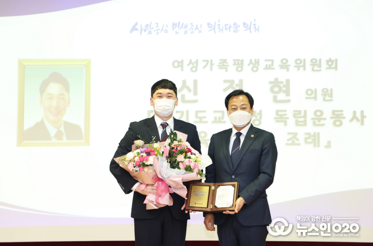 (뉴스인020 = 김성길 기자) 경기도의회 여성가족평생교육위원회 신정현(고양3, 더민주) 의원은 23일(화) 경기도의회 2020년 우수조례 발의의원으로 선정되어 경기도의회 의장 표창을 수상하였다.