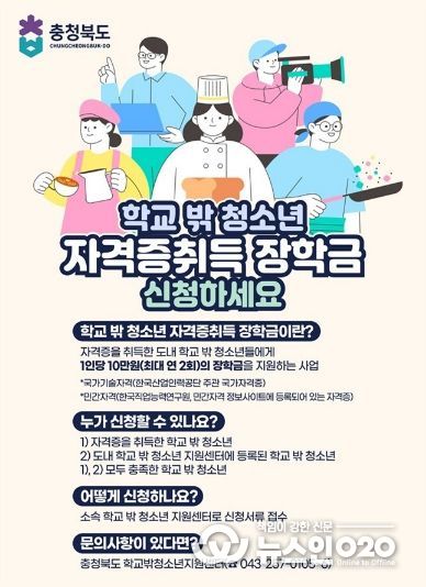 (뉴스인020 = 김성길 기자) 충청북도청소년종합진흥원(원장 김자중)은 학교 밖 청소년들의 성공적인 사회진출과 안정적인 자립을 돕기 위해 ‘충북 학교 밖 청소년 자격증 취득 장학금 지원사업’을 운영한다고 밝혔다.