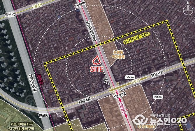 대상지는 9호선과 신분당선이 교차하는 신논현역 인근의 강남대로변에 위치하고 있으며, 업무시설을 포함한 복합문화 상업공간을 조성하는 사업이다. 이를 통해 강남도심의 업무기능이 강화되고 역세권 중심의 가로 활력이 확산될 것으로 예상된다.