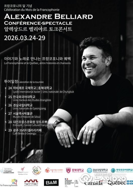 (뉴스인020 = 김성길 기자) 경상국립대학교 인문대학 불어불문학과는 3월 26일 오후 4시 인문대학 대강의실에서 캐나다 퀘벡 출신 예술가 알렉상드르 벨리아르(Alexandre Belliard)를 초청해 프랑스어권 아메리카의 역사와 문화를 주제로 한 토크콘서트를 개최한다.