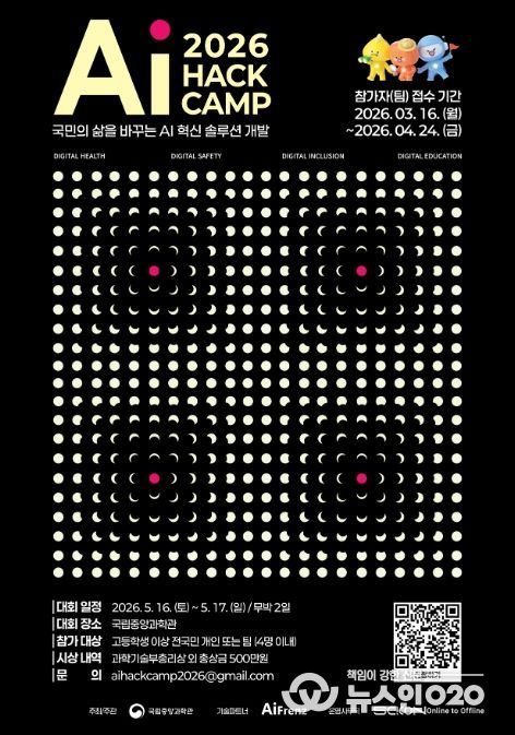 (뉴스인020 = 김나현 기자) 과학기술정보통신부 국립중앙과학관은 ‘국민의 삶을 바꾸는 인공지능 혁신 해결책(솔루션) 개발’을 주제로 5월 16일부터 17일(까지 무박 2일간 국립중앙과학관 미래 기술관에서'AI Hack Camp 2026'을 개최한다고 밝혔다.
