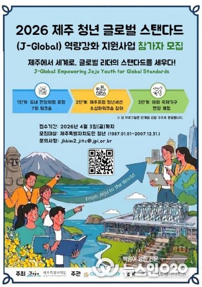 (뉴스인020 = 김성길 기자) 제주특별자치도는 유엔훈련연구기구(UNITAR) 제주국제연수센터와 손잡고 ‘2026년 제주청년 글로벌스탠다드 역량강화 지원사업’ 참가자 모집에 나선다.