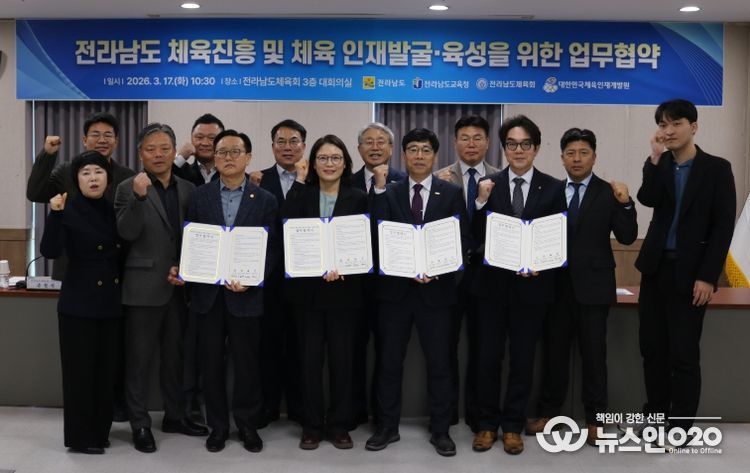 (뉴스인020 = 김성길 기자) 전라남도는 17일 전남도체육회에서 전남도교육청, 대한민국체육인재개발원, 전남도체육회와 함께 ‘전남 체육진흥 및 체육인재 발굴·육성을 위한 업무협약’을 하고, 지속 가능한 체육 인재 육성체계 구축에 나섰다.
