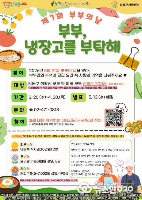 이번 공모는 3월 25일부터 4월 30일까지 온라인으로 진행되며, 강동구에 거주하거나 생활하는 부부 또는 예비부부라면 누구나 참여할 수 있다. 참여를 원하는 경우 QR코드를 통해 요리 사진과 사연을 제출하면 되며, 선착순 200쌍에게는 커피 기프티콘이 제공된다.