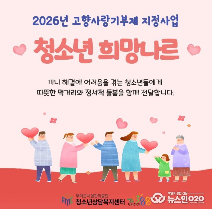 (뉴스인020 = 김성길 기자) 부여군시설관리공단 부여군청소년상담복지센터는 지역사회 기부금을 활용하여 돌봄 사각지대 청소년을 지원하는 고향사랑기부제 지정사업 '청소년 희망나르'를 추진한다고 밝혔다.