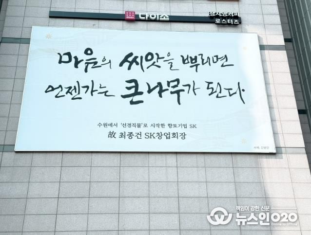 (뉴스인020 = 김성길 기자) 수원특례시는 SK 창업주 고 최종건 회장과 고 최종현 선대회장의 어록을 담은 ‘2026 수원희망글판’ 문안을 에이케이(AK)플라자 수원점 외벽과 아이비케이(IBK)기업은행 동수원지점 외벽에 게시했다.