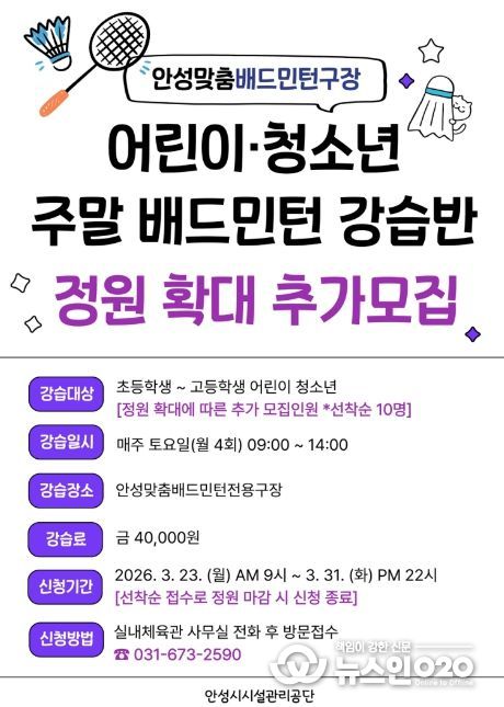 (뉴스인020 = 김성길 기자) 안성시시설관리공단은 안성 시민 생활체육 활성화를 위해 현재 운영 중인 주말 어린이・청소년 배드민턴 강습반 정원을 확대하고 추가 수강생을 모집한다고 밝혔다.