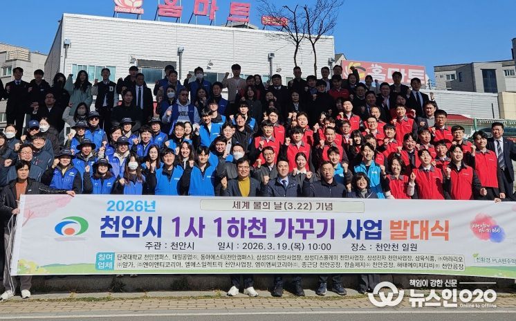 (뉴스인020 = 김성길 기자) 천안시는 세계 물의 날(3월 22일)을 기념해 19일 천안천 일원에서 ‘2026년 1사 1하천 가꾸기 사업’ 발대식을 개최하고 하천 정화활동을 진행했다.