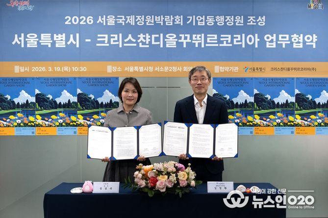 (뉴스인020 = 김성길 기자) 서울시는 크리스챤디올꾸뛰르코리아와 5월 1일 개막하는 ‘2026 서울국제정원박람회’의 성공적 개최를 위해 3월 19일 서울시청 서소문2청사에서 기업동행정원 업무협약(MOU)을 체결했다.