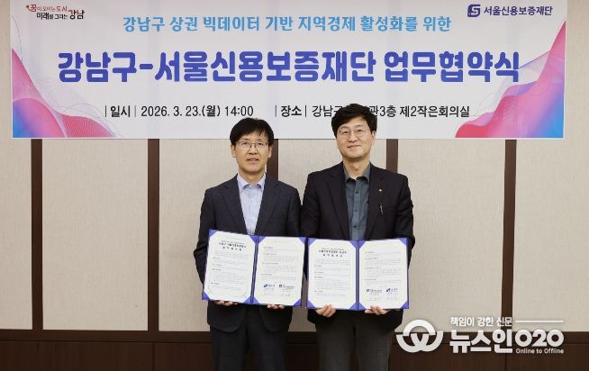 (뉴스인020 = 김성길 기자) 꿈이 모이는 도시, 미래를 그리는 강남구가 3월 23일 구청에서 서울신용보증재단과 업무협약을 체결하고, 지역상권 활성화와 소상공인 지원을 위한 빅데이터 기반 협력체계 구축에 나섰다. 상권 현황을 보다 정밀하게 분석해 지역 특성에 맞는 정책을 발굴하고, 소상공인이 체감할 수 있는 지원책으로 연결하겠다는 취지다.
