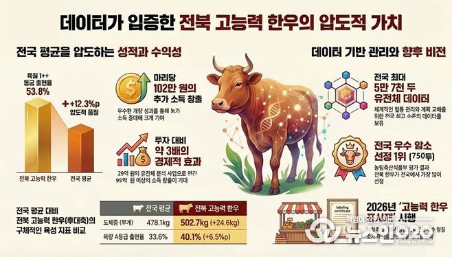 또한 전북은 한우 개량 분야에서 이미 전국 상위 수준의 1++ 출현율을 유지해 왔으며, 농림축산식품부 우수 암소 선발에서도 가장 많은 개체가 선정되는 등 성과를 축적해 왔다. 이번 분석은 이러한 성과가 실제 농가 소득으로 연결되고 있음을 보여준 사례다.