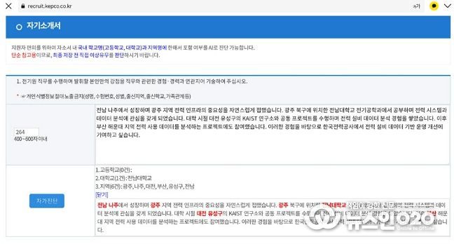 (뉴스인020 = 김성길 기자) 한국전력이 채용 지원자의 편의를 높이고 공정한 채용 환경을 조성하기 위해, 자기소개서 AI 자가 진단과 네이버 인증 기반 자격증 자동 반영 서비스를 채용 시스템에 전격 도입한다.