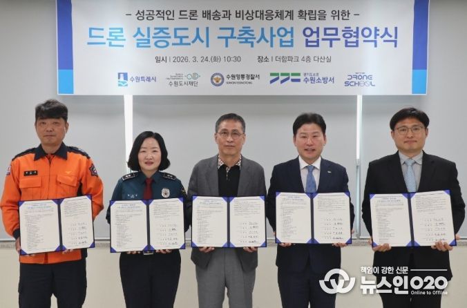 (뉴스인020 = 김성길 기자) 수원특례시, 수원도시재단, 수원영통경찰서, 수원소방서, ㈜드론스쿨인터네셔널은 24일 더함파크에서 ‘드론 실증도시 구축 사업’ 추진을 위한 업무협약을 체결하고, 협력을 약속했다.