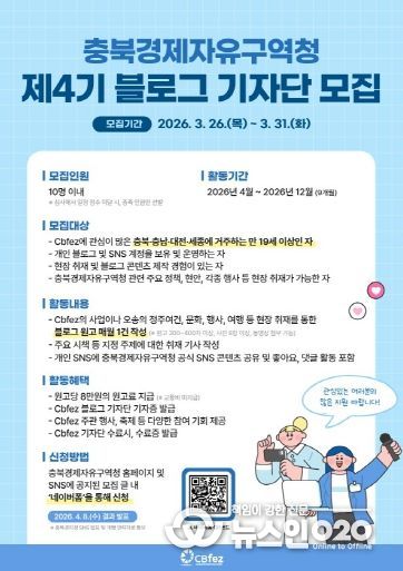 (뉴스인020 = 김성길 기자) 충북경제자유구역청은 충북경제자유구역의 역동적인 발전상과 정주 여건을 심도 있게 전달할 ˊ2026년 제4기 블로그 기자단ˊ을 모집한다고 밝혔다.