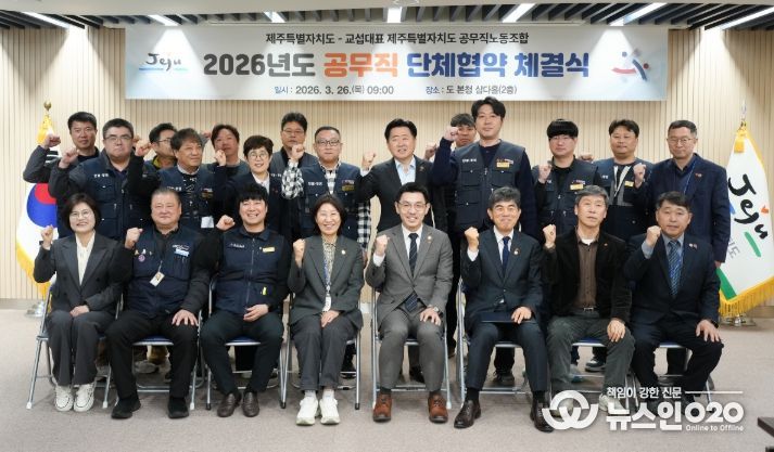 (뉴스인020 = 김성길 기자) 제주특별자치도와 교섭대표 노동조합인 제주도 공무직노동조합이 26일 도청 삼다홀에서 ‘2026년도 공무직 단체협약’을 체결했다.