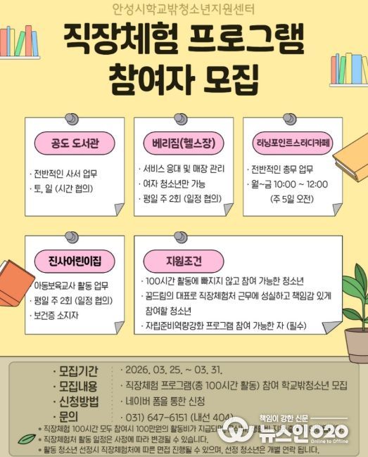 (뉴스인020 = 김성길 기자) 안성시학교밖청소년지원센터는 3월 25일부터 3월 31일까지 7일간 상반기 직장체험 프로그램 참여 청소년을 모집한다.