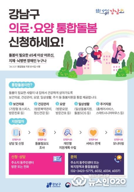 (뉴스인020 = 김성길 기자) 꿈이 모이는 도시, 미래를 그리는 강남구가 3월 27일부터 어르신과 장애인 등이 살던 곳에서 의료·요양·돌봄 서비스를 통합 지원받는 ‘강남형 통합돌봄’ 본사업을 시작한다.
