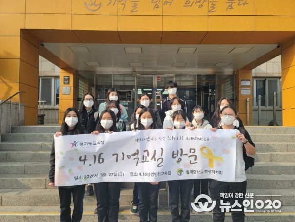 (뉴스인020 = 김성길 기자) 안양 범계중학교(교장 박경숙) 학생자치회 학생 20여 명은 3월 27일에 세월호 참사의 교훈을 되새기고 생명 존중 문화를 확산하기 위해 경기도교육청 4.16생명안전교육원(안산시 단원구 소재)을 방문했다. 이번 방문은 매년 범계중학교에서 진행되는 ‘국민 안전의 날’ 행사 진행에 앞서 학생자치회가 주도적으로 기획했다. 12년이라는 시간이 지나 학생들이 ‘세월호 사건’을 잘 체감하지 못하는 것을 인식하고 이를 먼저 느끼고 알리고자 한 것이다.