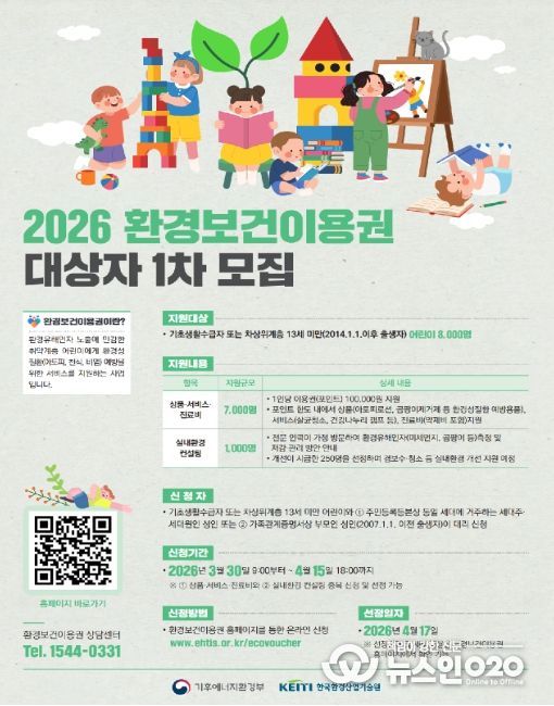 (뉴스인020 = 김나현 기자) 기후에너지환경부는 3월 30일부터 4월 15일까지 환경유해인자 노출에 취약한 계층의 환경보건 증진을 위해 ‘2026년 환경보건이용권’ 신청(1차)을 받는다.