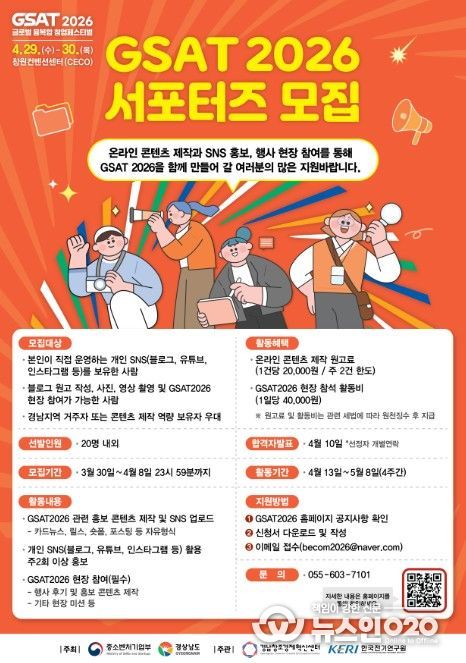 (뉴스인020 = 김성길 기자) 경상남도는 글로벌 융복합 창업페스티벌 ‘GSAT 2026’의 추진사항과 생생한 현장을 국내·외에 전할 ‘GSAT 2026 서포터즈’를 4월 8일까지 모집한다고 밝혔다.