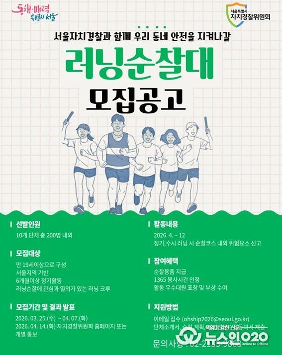 (뉴스인020 = 김성길 기자) 서울시 자치경찰위원회는 러닝을 하며 동네 안전까지 함께 살피는 시민 참여형 활동인 서울 러닝 순찰대에 참여할 2026년 신규 대원을 모집한다. 올해는 10개 단체(크루) 200명 규모로 확대해 운영할 계획이다.