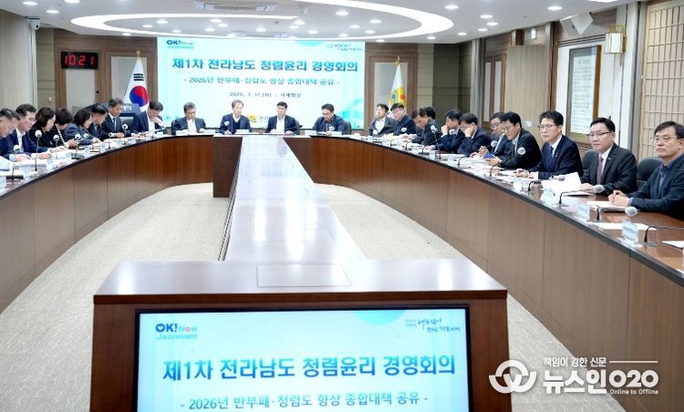 (뉴스인020 = 김성길 기자) 전라남도는 3월 31일 도청 서재필실에서 도지사 권한대행 주재로 실·국장들이 참석한 가운데 ‘2026년 반부패·청렴도 종합대책 공유회의’를 개최하고, 청렴도 향상을 위한 추진 방향과 실행계획을 공유했다.