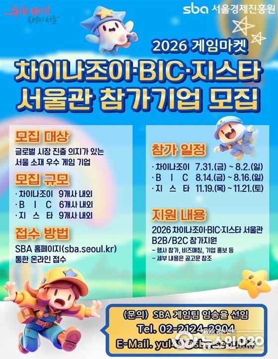 (뉴스인020 = 김성길 기자) 서울시와 서울경제진흥원(SBA)은 서울 소재 우수 게임 콘텐츠의 해외 시장 개척 및 판로 확대를 지원하기 위해 ‘2026 게임마켓 서울관’ 참가기업을 모집한다고 밝혔다.