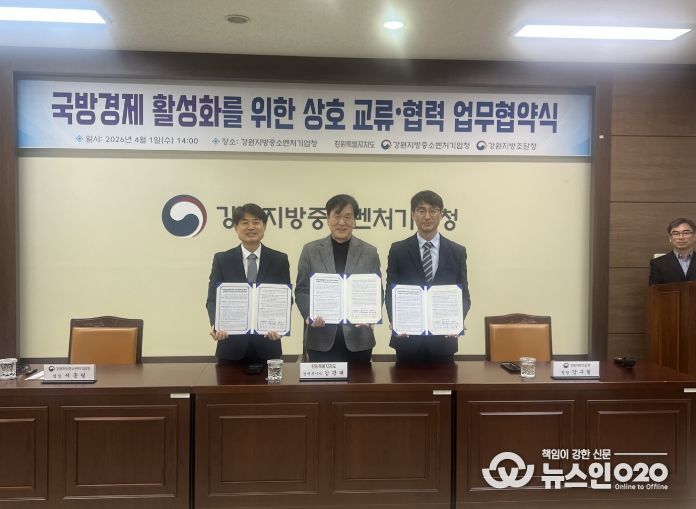 (뉴스인020 = 김성길 기자) 강원특별자치도는 4월 1일 오후 2시 강원지방중소벤처기업청 중회의실에서 강원지방중소벤처기업청, 강원지방조달청과 함께 도내 중소기업의 군납시장 진출 지원과 국방경제 활성화를 위한 업무협약을 체결했다.
