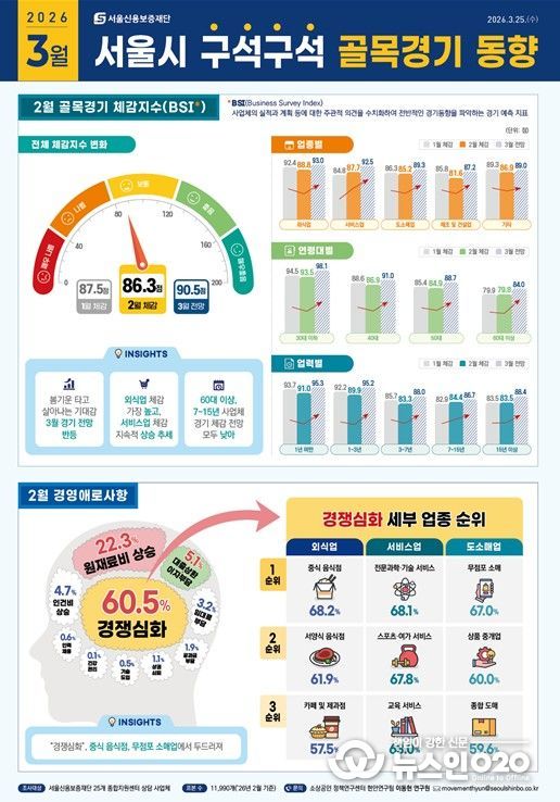 (뉴스인020 = 김성길 기자) 서울신용보증재단이 매월 발간하는'서울시 구석구석 골목경기 동향'이 월별 골목경기 동향에 더해 업종별 매출·소득과 경영애로, 자금 활용까지 분석 범위를 확대했다. 소상공인 체감경기를 다양한 항목으로 진단해 현장 활용도를 높인 것이 특징이다.