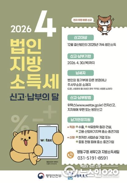 (뉴스인020 = 김성길 기자) 수원시 영통구는 4월 1일부터 30일까지 법인지방소득세 확정신고 기간을 맞아 관내 7,500여 개 법인과 세무대리인을 대상으로 신고 안내를 강화했다. 기한 내 원활한 신고·납부를 돕기 위해 대상 법인과 세무대리인에게 안내문도 발송했다.