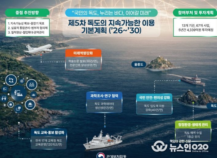 (뉴스인020 = 김성길 기자) 경상북도는 정부가 발표한 ‘제5차 독도의 지속가능한 이용을 위한 기본계획’과 2026년 시행계획에 발맞춰 독도의 실질적 관리주체로서 현장중심의 정책을 본격 추진한다.