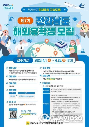 (뉴스인020 = 김성길 기자) 전라남도와 전남인재평생교육진흥원은 글로벌 핵심 인재 육성을 위해 세계 명문대 유학 기회를 제공하는 ‘제7기 전라남도 해외유학생’을 오는 28일까지 모집한다고 밝혔다.