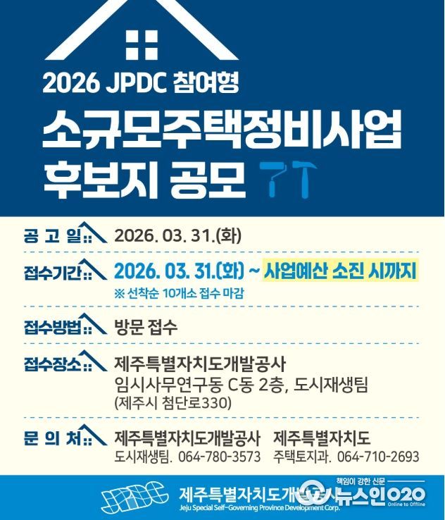 (뉴스인020 = 김성길 기자) 제주특별자치도와 제주특별자치도개발공사(사장 백경훈)는 대규모 정비사업 추진이 어려운 노후 주거지의 환경을 개선하고, 양질의 주택공급을 확대하기 위해 작년에 이어 올해에도 ‘JPDC참여형 소규모주택정비사업 신규 후보지 발굴 공모’를 실시한다고 밝혔다.