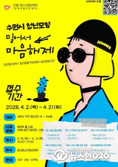 (뉴스인020 = 김성길 기자) 수원시청소년청년재단 청청마음건강센터는 사회적 관계 맺기에 어려움을 느끼거나 정서적 소진을 경험하는 지역 청년들을 위해 청년 자조모임 '밀어서 마음해제' 참여자를 모집한다.