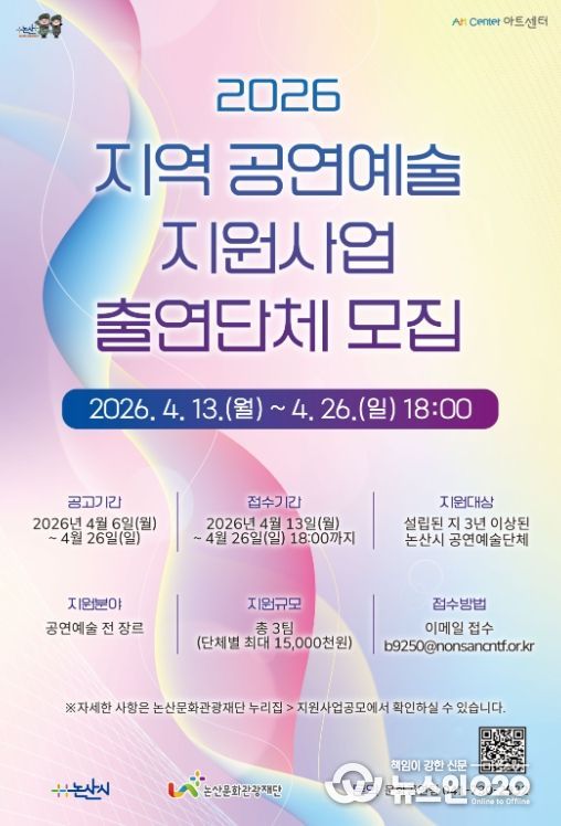 (뉴스인020 = 김성길 기자) (재)논산문화관광재단은 오는 4월 13일부터 4월 26일까지 ‘지역 공연예술 지원사업’ 출연단체 모집 공모를 진행한다.