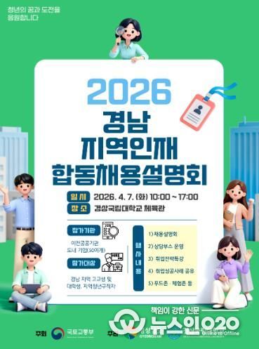 (뉴스인020 = 김성길 기자) 경상국립대학교는 공공기관 및 기업 채용 정보를 제공하여 지역 청년들의 취업 기회를 확대하기 위해 4월 7일 오전 10시부터 오후 5시까지 가좌캠퍼스 체육관(월계관)에서 ‘2026년 경남·울산 지역인재 합동 채용설명회’를 개최한다.