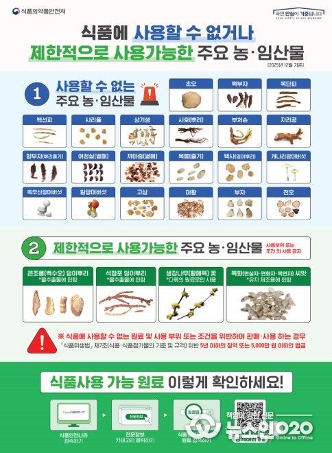 (뉴스인020 = 김나현 기자) 식품의약품안전처는 농·임산물 온·오프라인 판매업체 총 402곳에 대해 3월 9일부터 13일까지 점검한 결과, 식용으로 섭취 불가한 농·임산물을 식품용으로 판매한 업체 2곳을 적발했다고 밝혔다.