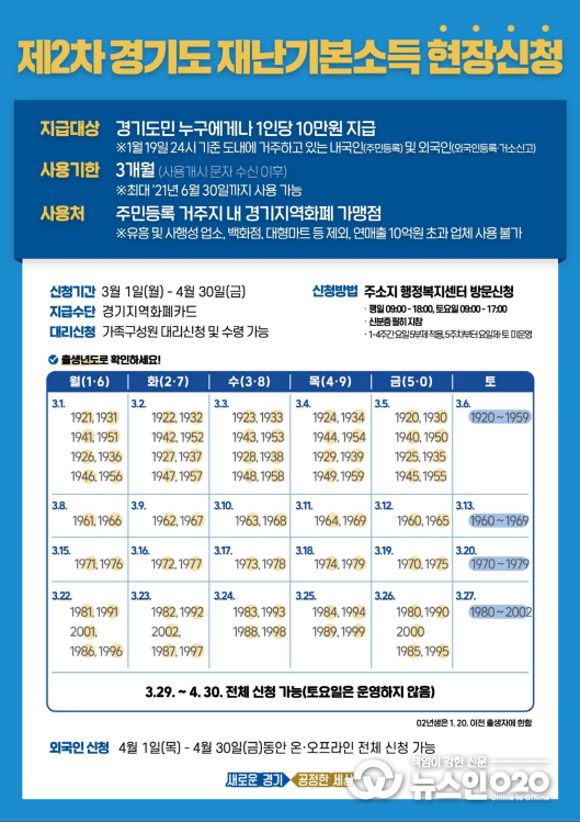 (뉴스인020 = 김민석 기자) 평택시는 시민 모두가 ‘제2차 경기도 재난기본소득’을 빠짐없이 받을 수 있도록 읍・면・동행정복지센터에서 현장접수를 진행한다.