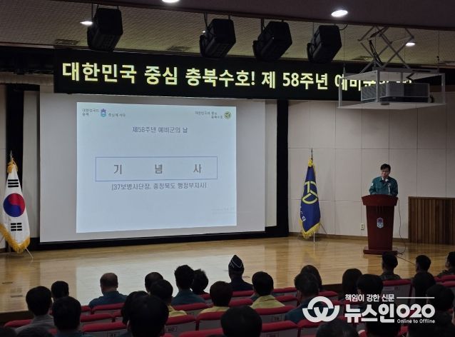 (뉴스인020 = 김성길 기자) 충북도는 4월 3일 충북미래여성플라자 대강당에서 창설 제58주년 예비군의 날을 기념하여 김영환 충북도지사, 김경수 제37보병사단장, 도내 예비군 지휘관 등 200여 명이 참석한 가운데 예비군 창설의 의의를 선양하고 사명감과 자긍심을 고취시킴으로써 자주국방과 완벽한 지역 향토방위 결의를 다지는 기념식을 개최했다고 밝혔다.